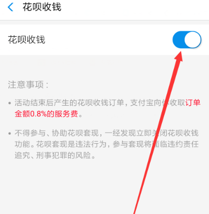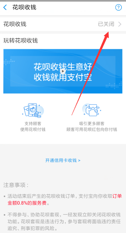进入新的界面,看到“花呗收钱”选项是关闭状态,将其打开,