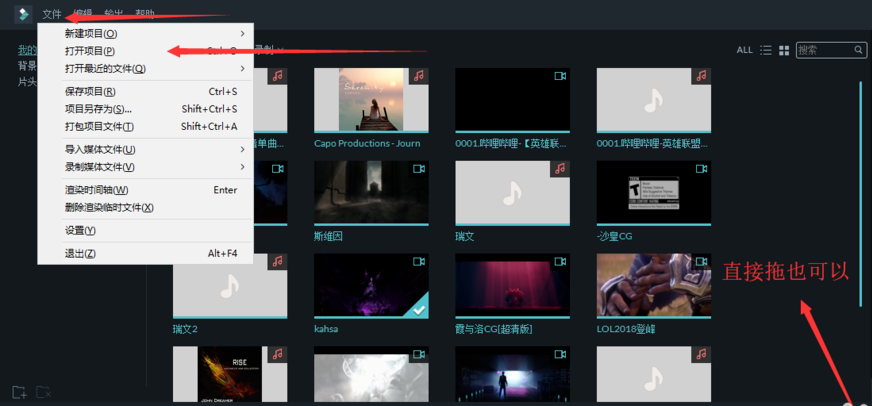 打开万兴神剪手,点击文件——打开项目,导入视频文件,或者直接拖进去,