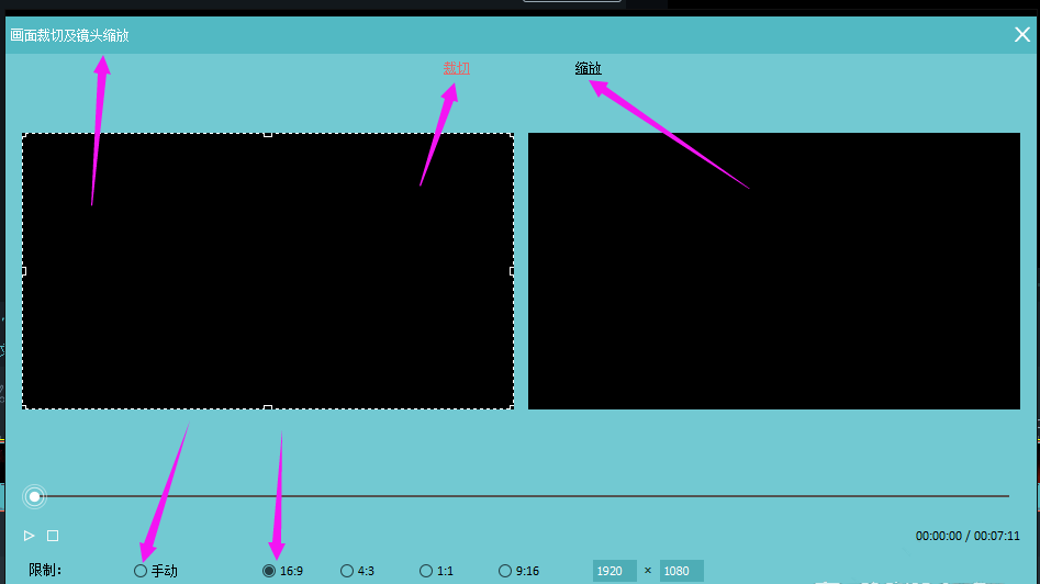 根据需要开始剪切缩放视频,然后选择固定尺寸或者手动自定义,点击确定,