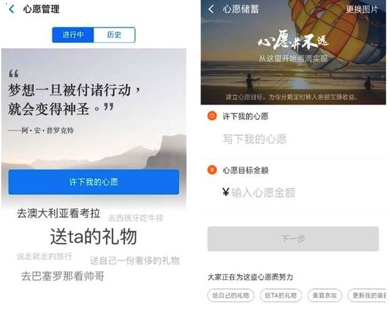 很多小伙伴总是忍不住乱花钱,妥妥滴一枚月光族!这个功能可以帮你设定心愿以及实现时间,设定之后会定期从你的银行卡扣钱,帮你改掉乱花钱的坏习惯。
