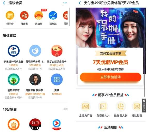 上网追剧最讨厌遇到广告、还有付费视频,真烦人!别急,如果你是支付宝铂钻会员,可以用蚂蚁积分兑换优酷会员,普通会员也可以用499积分换取周卡。