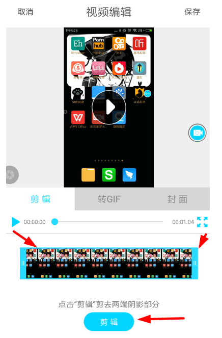滑动进度条可以截取视频内容,操作完毕,点击“剪辑”按钮即可生成新的视频文件,然后点击保存。