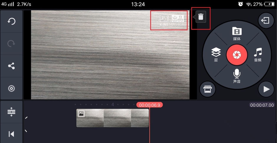 回到相片视频处理页面,在相片右上角会显示水印“巧影出品”,点击水印旁边的“垃圾箱”,如图,