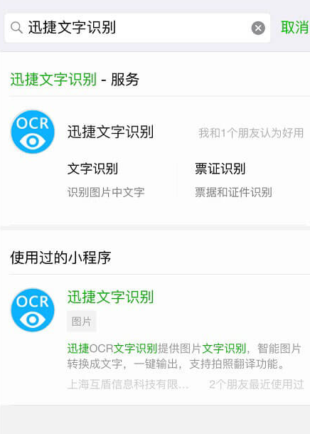打开微信,点击搜索“迅捷文字识别”小程序,找到小程序并进入,
