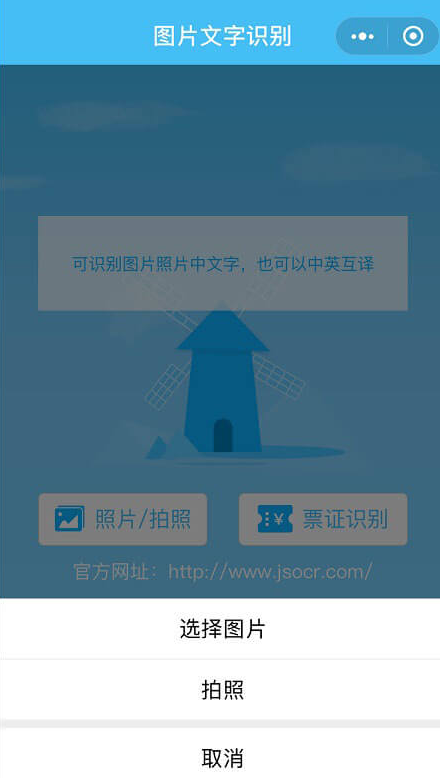 进入小程序,可以看到两个功能按钮——照片/拍照、票证识别,这里以拍照识别为例,