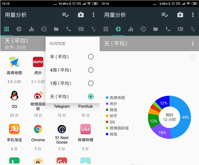 用量分析APP还可以查看使用APP的时间分布,例如在星期几使用手机的时间最长。如果看到工作日的用手机时间比休息日还多,那就得问问自己到底有没有划水摸鱼了。这款用量分析APP小工具还可以详细记录APP开启的时间,在什么时候开启什么APP用了多久,一目了然。如果看到列表当中总是被特定的APP刷屏,那对这APP上瘾的嫌疑就非常大了。
