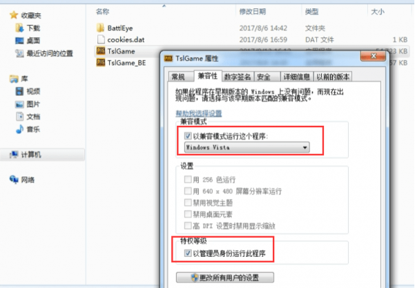 分别将“TslGame”和“slGame-BE”这两个进程文件以兼容模式和管理员身份运行;以“TslGame”为例,右击“TslGame”-属性-兼容性-勾选“以兼容模式运行这个程序”-在勾选“以管理员身份运行此程序”-应用。(“TslGame-BE”重复一遍以上操作就行