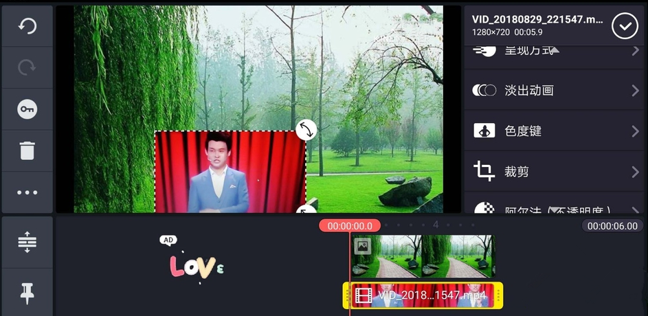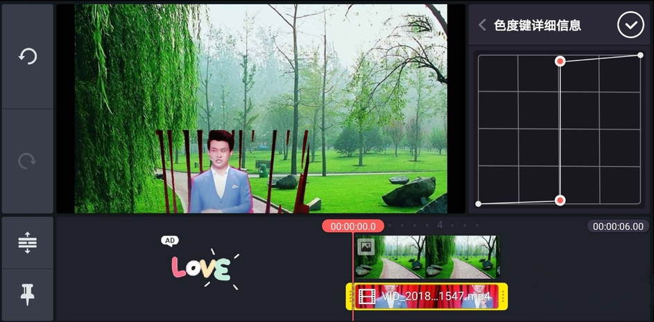 调整视频素材的大小和位置,然后选择色度键,