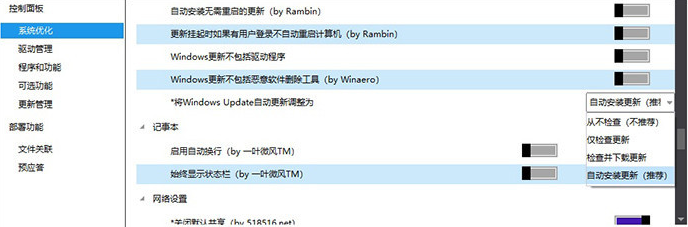 除此之外,这里还包含着一项关闭Windows Update的选项。不得不说,这正是很多小伙伴遍寻已久的功能,毕竟关闭自动更新有时会导致系统无法接收到微软的安全更新,从而给系统造成隐患。