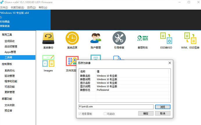 这个应该算是Dism++的黑科技了,你可以把它看作是ghost(一款系统备份工具)的Windows版。整体思路和ghost基本没啥两样,当你装好系统后,点击常用工具——工具箱——系统备份,进行系统备份,当系统出现故障时再利用相同步骤将备份进行恢复。它的最大特色在于,备份可以在电脑正常运行时开启,也就是说,在你看电影或者写文档时,也不会耽误系统备份的正常运行。