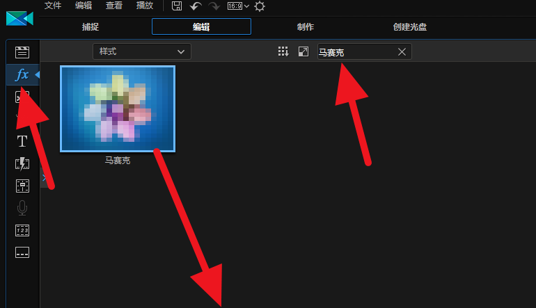 点击左上角的fx,在搜索框中输入马赛克,出来效果图,将马赛克拖到新的时间线上,