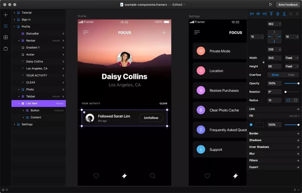 Framer X是一个基于CoffeeScript的交互原型工具,使用了更为抽象的Frame和Stack概念。Framer X在 app 里集成了components商店,可以很方便地下载、引用,也可以发布自己的 components。