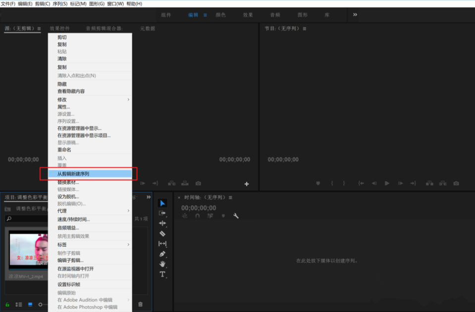 导入视频素材,鼠标右键单击视频,点击“从剪辑新建序列”,