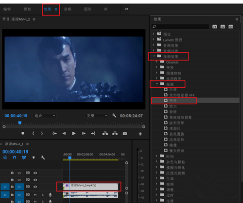 选中视频轨道,点击上方的效果,在右侧栏中点击视频效果——扭曲,然后双击“变换”,