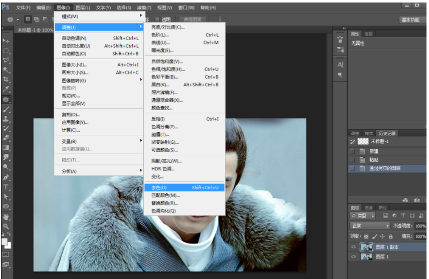 2、复制一层,对复制的图层进行去色,点击菜单栏的图像——调整——去色,或者直接按住Shift+Ctrl+U快捷键,