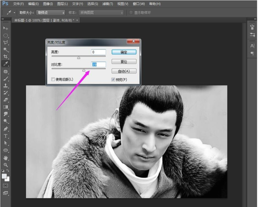 3、如果黑白对比不明显,可以调整对比度,点击图像——调整——亮度/对比度,或者按住快捷键C,