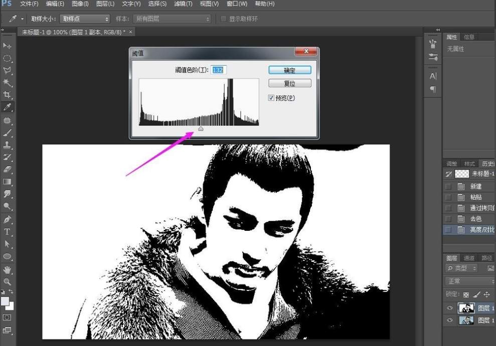 对图层进行阈值处理,点击菜单栏的图像——调整——阈值,