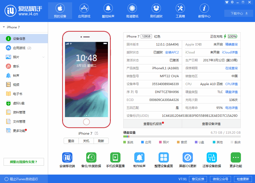 将iPhone手机连接到电脑,打开爱思助手,点击上方的“刷机越狱”,进入“一键刷机”界面,