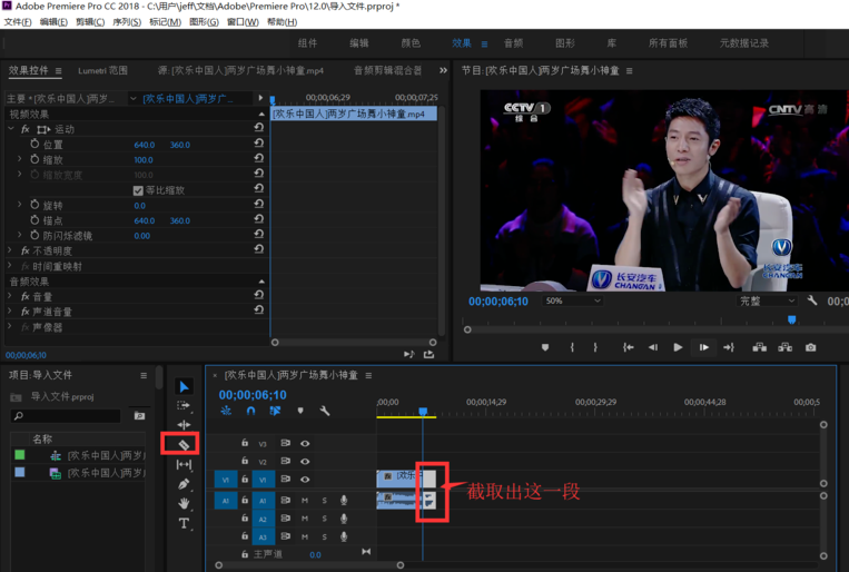 用剃刀工具截取需要慢放的片段,点击选择工具选中,