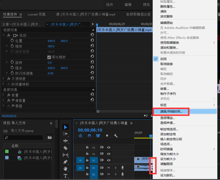 右击视频片段,弹出选项,点击“速度/持续时间”,如图,