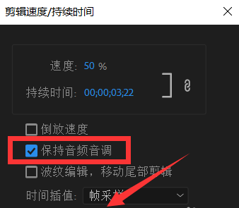 不急,回到剪辑速度/持续时间窗口,勾选“保持音频音调”选项即可。