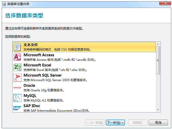 进入数据库设置向导界面,选择数据库类型,点击【文本文件】,进行下一步,