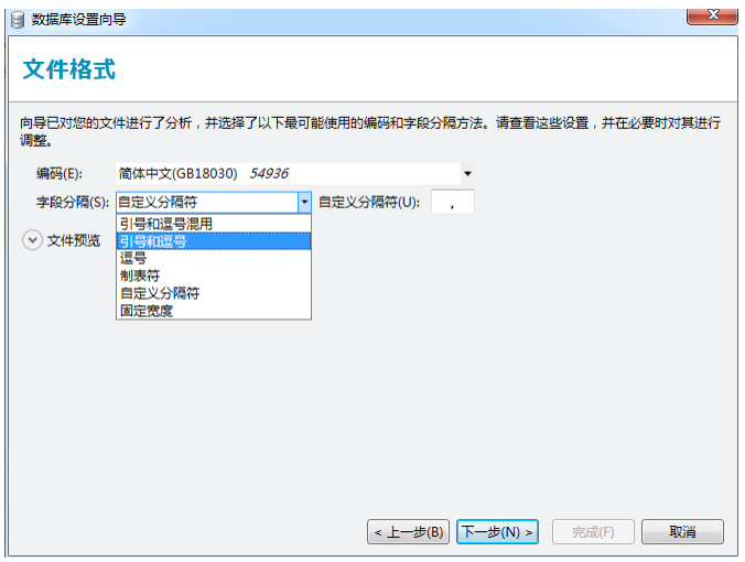 如图,在文件格式界面点击【字段分隔】——【引号和逗号】,进行下一步,