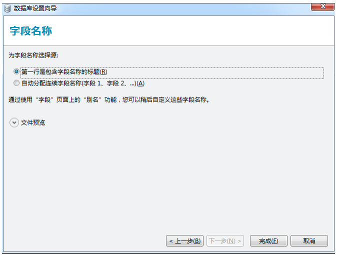 在字段名称中勾选【第一行是包含字段名称的标题】,点击完成,