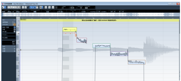 点击“VariAudio”项目下的“音高/弯曲”按钮,将会扫描音频波形,并以方块和线条的形式显示出来,