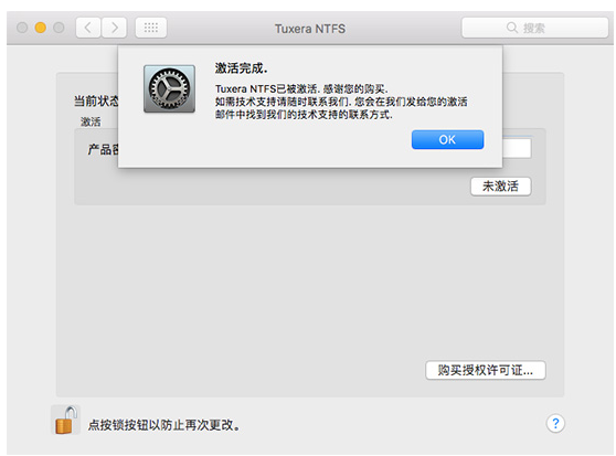 3、如图,Tuxera NTFS软件被成功激活了,还会跳出提示框,