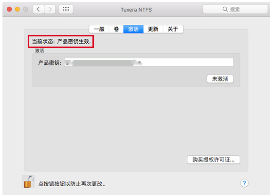 4、再次查看激活界面,软件当前状态为“产品密钥生效”,Mac用户可以长期使用Tuxera NTFS for Mac了。