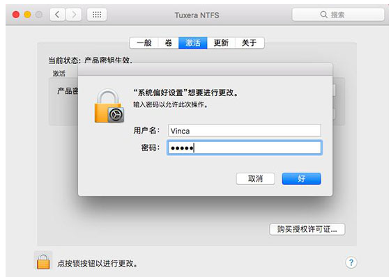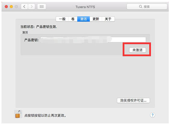 打开Tuxera NTFS For Mac,进入界面,点击“激活”选项,你可以看到当前状态是“产品密钥生效”,“未激活”按钮是灰色的,点击界面下方的小锁按钮,