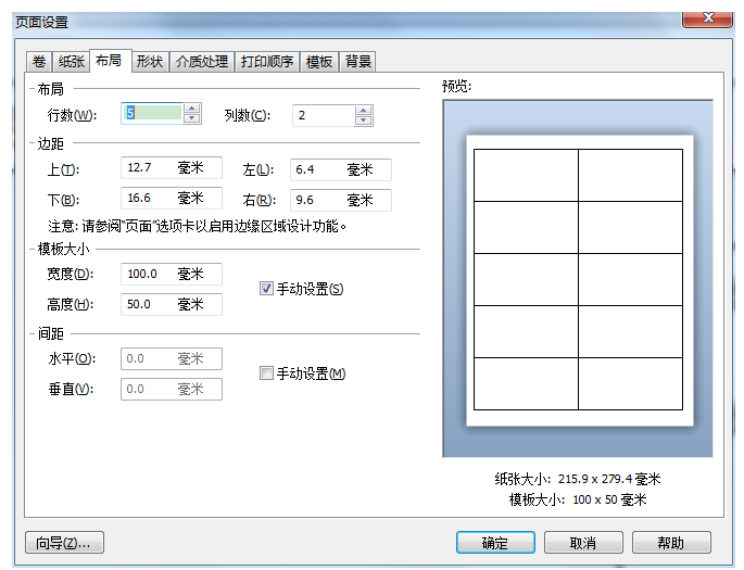 2、双击模板,弹出【页面设置】窗口,根据实际情况选择纸张大小、模板大小、模板形状等,