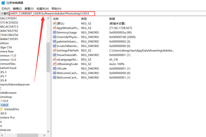 这时会弹出注册表编辑器,输入路径:HKEY_CURRENT_USER\\Software\\Adobe\\Photoshop\\120.0,找到Photoshop文件夹并打开,