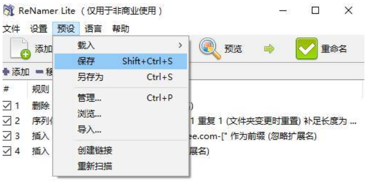 如果你经常需要进行文件批量重命名,ReNamer还允许你保存重命名规则,等到下次处理新文件时就可以直接一键套用,非常方便。