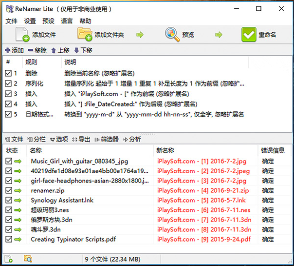 值得注意的是,ReNamer支持多个改名规则组合使用,在批量重命名文件时可以一次性执行多个不同的改名规则,从而满足广大用户的各种复杂改名需求。