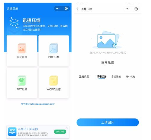 迅捷压缩,这个小程序可谓是职场办公人士的利器,可以对图片、Word、PDF、PPT文件进行压缩,你可以自行选择压缩的文件格式,非常实用。