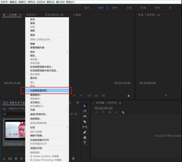 导入视频素材,右击视频,选择【从剪辑新建序列】,如图,