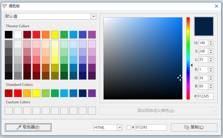 这是PicPick提供的调色板,我们可以自行设定RGB的色彩浓淡,标明之后可以让他自动产生包含HTML、RGB在内的各式色码编号。下方还有取色器,方便提取屏幕上的任意颜色。