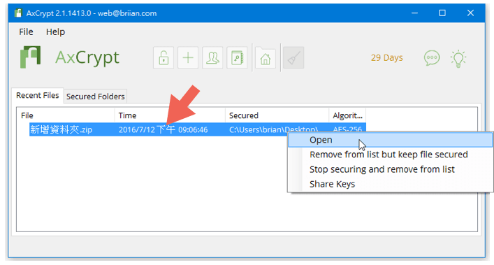 收到AxCrypt寄来的Email,依照相关指示取得启动码并正确输入,然后自行设置一个稍稍复杂的密码,注意,每次登录AxCrypt软件都会用到这个密码,
