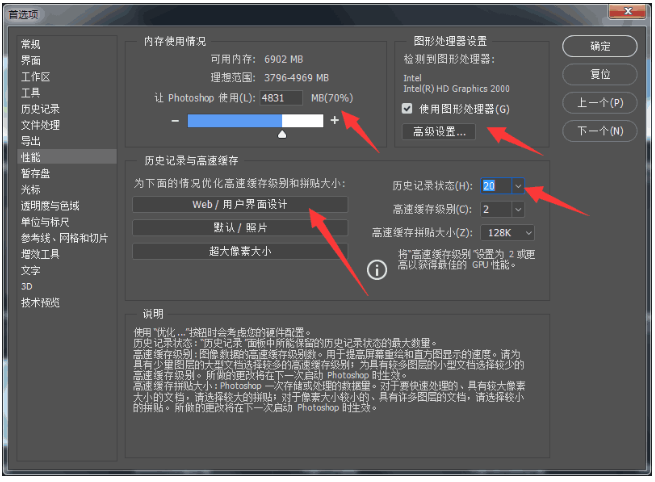 高速缓存:如果你是设计师,可以选择【Web/用户界面设计】、【超大像素大小】,设定完毕,右侧的【高速缓存级别】和【高速缓存拼贴大小】会进行自动设定。