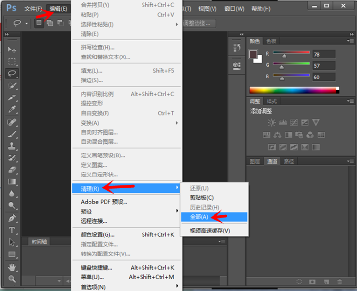 PS工作时间过长,运行速度会变缓慢,这是因为你没有及时释放占用的内存,重启PS软件就行了。如果你不想重启,可以快速清理PS占用的内存空间,点击菜单栏的【编辑】——【清理】——【全部】,清理所有历史记录和剪切板的任何信息。