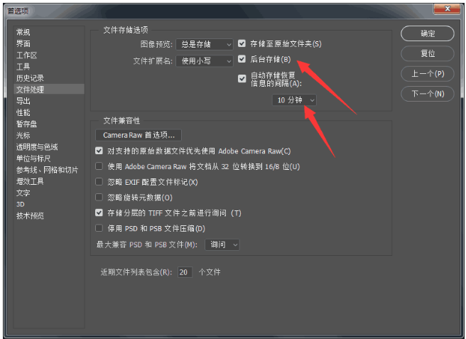 设置后台存储与自动保存,可以帮助我们应对突发情况。点击菜单栏的【编辑】——【首选项】——【文件处理】,勾选【后台存储】,设置自动存储时间,可以存储较大文件时继续用PS工作,如果关掉,就没办法使用自动存储。
