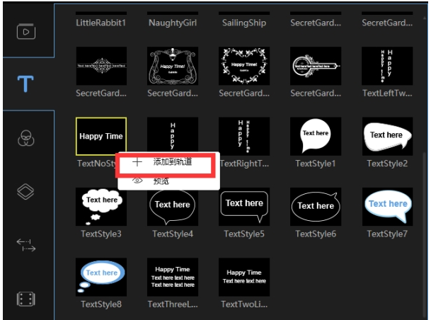 裁剪完毕,点击文字素材,选择其中一款,右击【添加到轨道】,