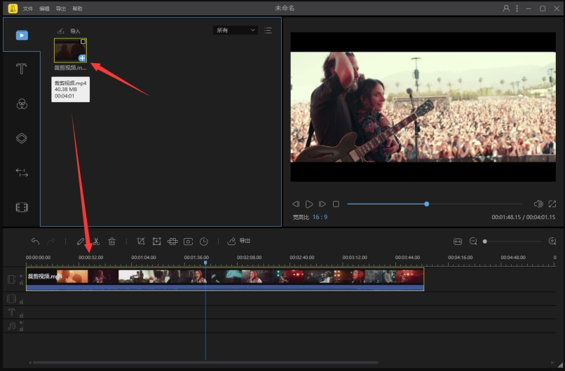 导入视频文件,点击视频素材中的“+”,将视频添加到轨道上,