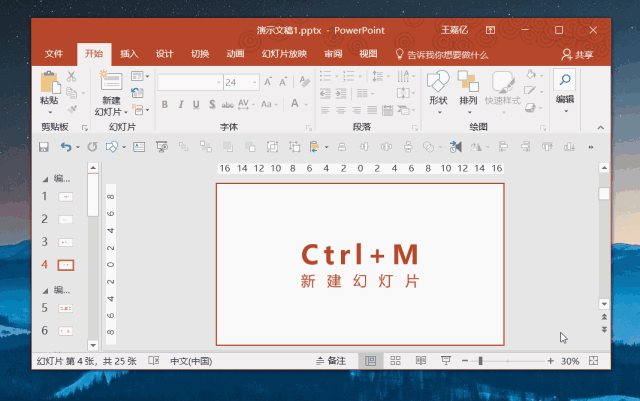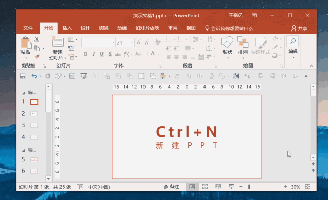 刚刚创建了一个PPT文件,现在让你重建一个新的文稿,按Ctrl+N快捷键即可快速新建。