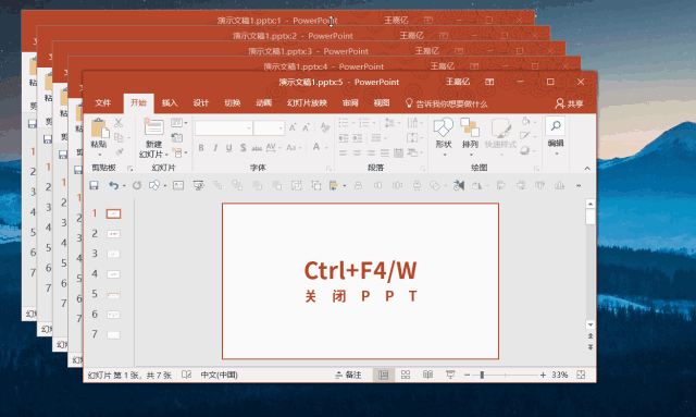 在桌面上打开了多份PPT文件,看着眼花缭乱,想着一个一个手动关闭,又太麻烦了。直接定位到需要关掉的PPT,按Ctrl+W或者Ctrl+F4,关闭PPT。