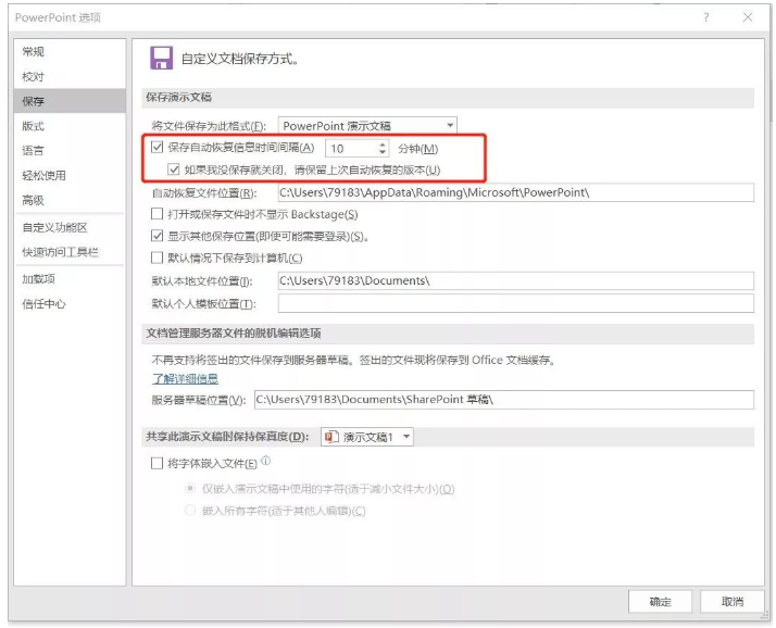 大家注意,一定记得设置PPT文件自动保存((路径:文件–>选项–>保存)),这个习惯可以让你有效应对断电、意外关机等情况。