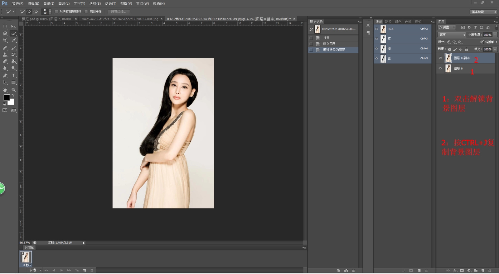 打开Photoshop软件,导入图片素材,按【CTRL+J】快捷键,复制图层,来到通道面板,观察通道的明暗反差,选择反差较大的那个通道来进行操作。