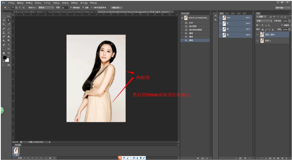 在左侧工具栏中点击【魔棒工具】,在副本里用鼠标左击需要删除的地方,会出现蚂蚁线,按Delele键清除,